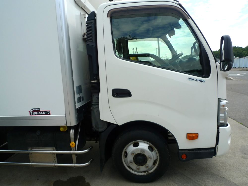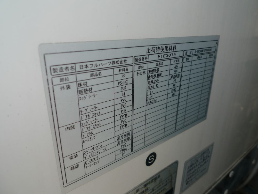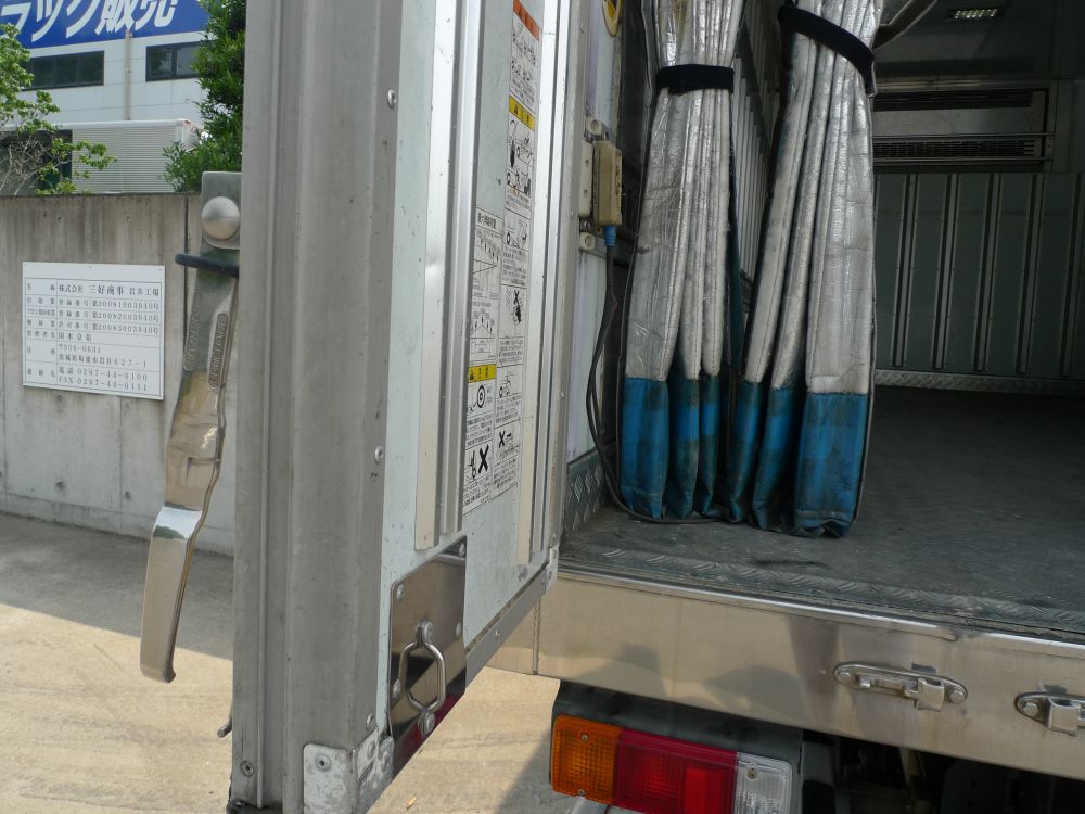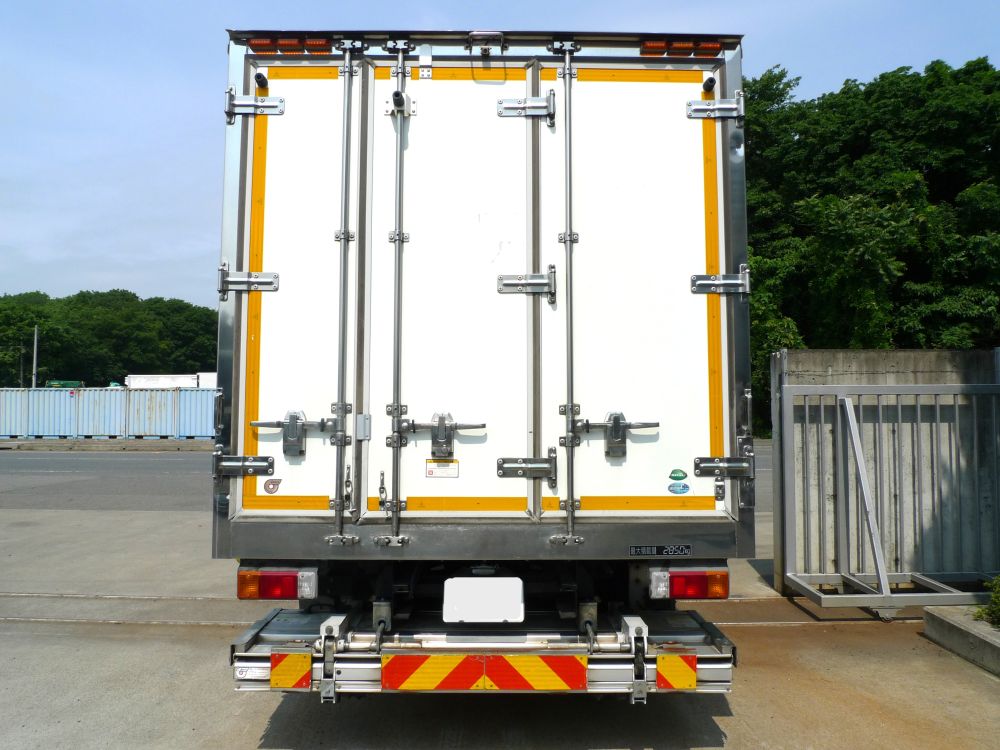 日本フルハーフ製(E1E3075)平成23年製、三菱製冷凍機(2時間で18度~-17度確認済み)、-30℃設定、格納ゲート付き、サイドドア、サイドバンパー2段、ラッシングレール2段、水抜き穴、床縞板、マーカーランプ4対、バックモニター