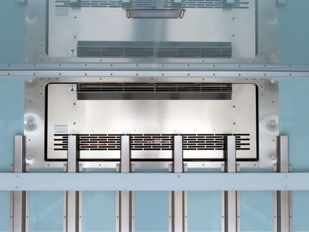 冷凍機は菱重製・-30℃設定・直冷式で床面はシステムフロアです。