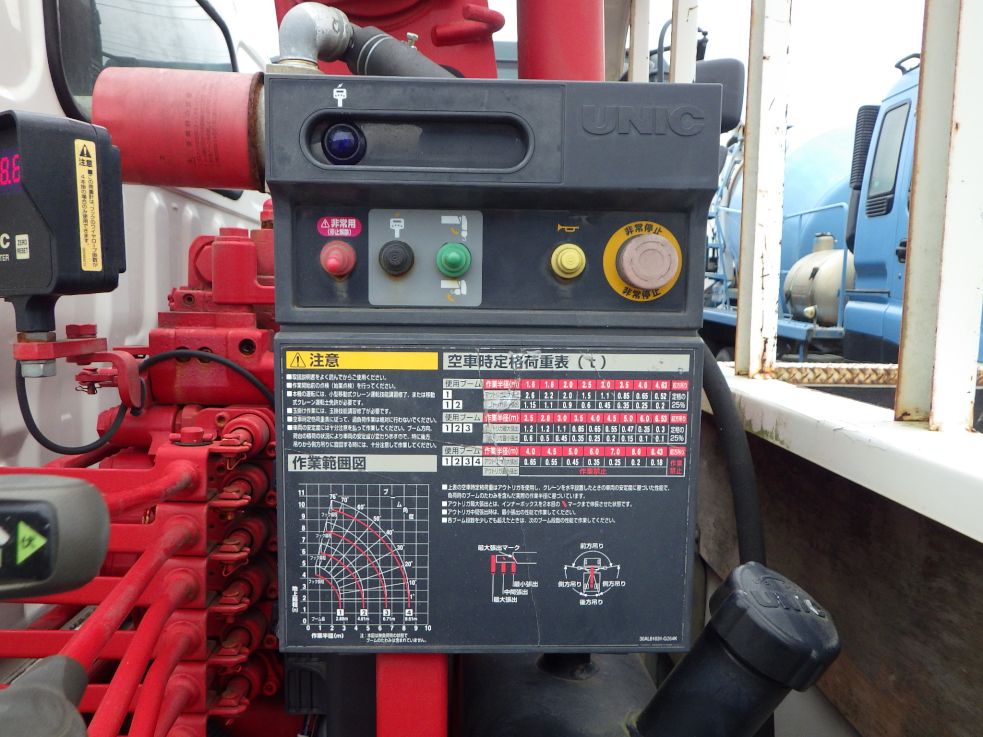 クレーンはユニック製の4段ブーム、ラジコン・フックイン付きです。フックは2.63t吊りとなります。